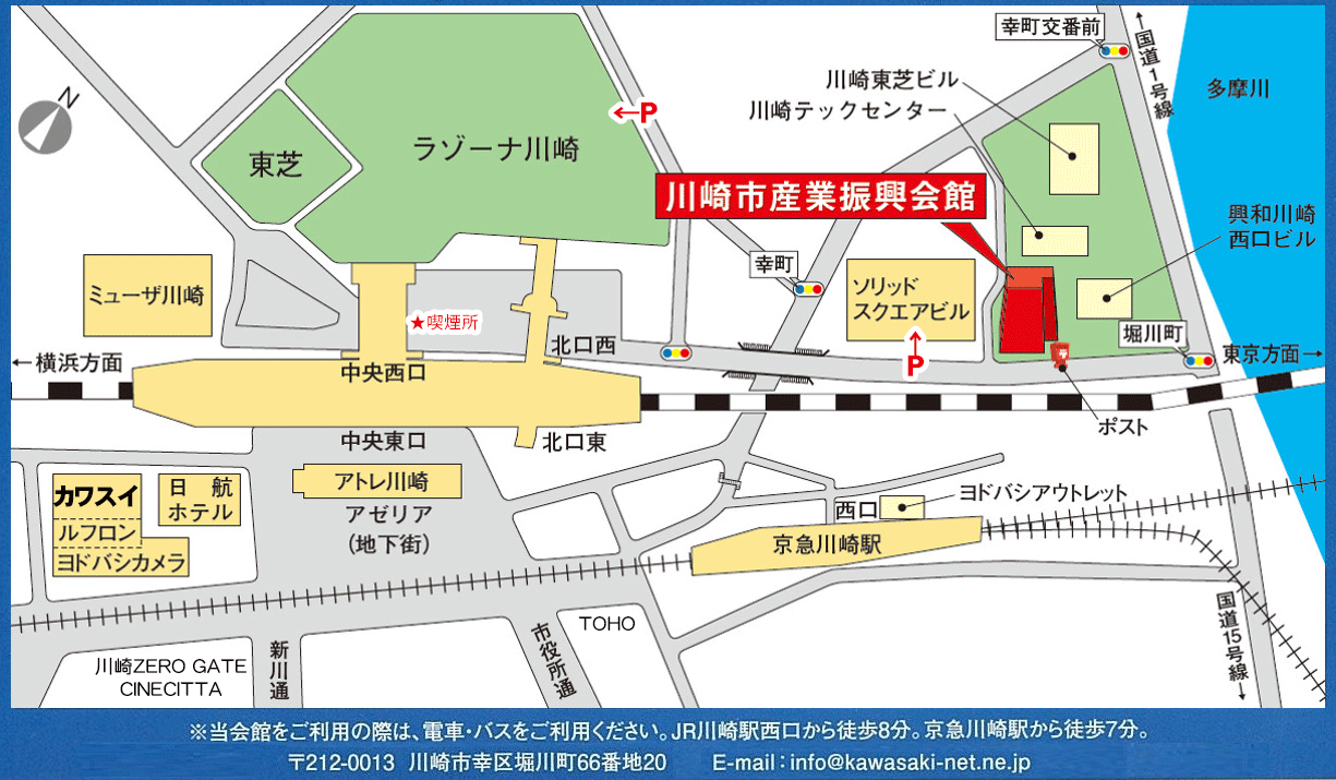・川崎市産業振興会館は駐車場がありません。車で来場される方は会場のすぐ隣、ソリッドスクエアビル(西側にあるツインタワービル)の地下駐車場(30分、200円)、もしくはラゾーナ川崎プラザのパーキング等をご利用ください。