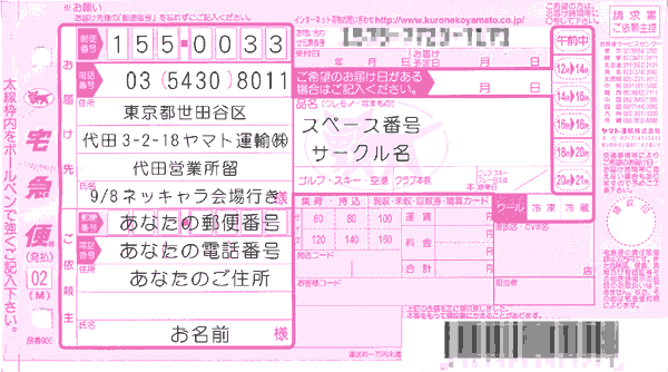 ・荷物は各スペースへ直接クロネコヤ配達していただけますので、伝票とは別に、箱に分かりやすいように「サークル名、スペース番号」を書いてください。