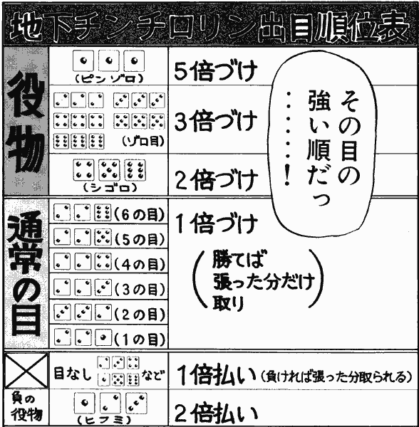 ・サイコロを三つどんぶりに投げ込んでその目で勝ち負けが決まる。