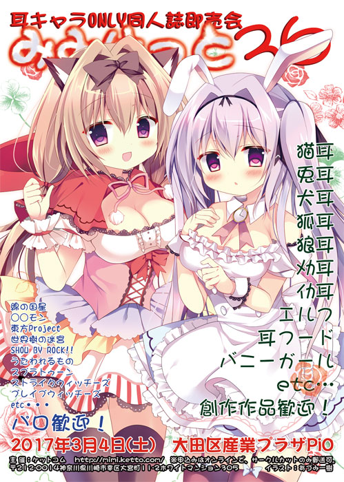 [2017/03/06]次回、「みみけっと37」は2017/07/16(日)にて、「ジャパリケット」と併催予定で開催決定! サークル参加申込みは少々お待ちください。 [2017/02/17] 本日、川崎港郵便局より、サークル参加案内発送しました。 [2017/02/08] カタログの前売り案内掲載しました。 [2017/01/28] 配置図、サークルリストに配置番号掲載しました。 [2017/01/26] 追加募集は1/27金で締め切ります。 [2017/01/12] みみけっと36参加サークルリスト掲載しました。 既に申込み済みサークル様におきましては落選等ございません。 [2016/11/12] サイト更新しました。「みみけっと36」サークル参加要項 掲載&受付中! 過去のお知らせ |