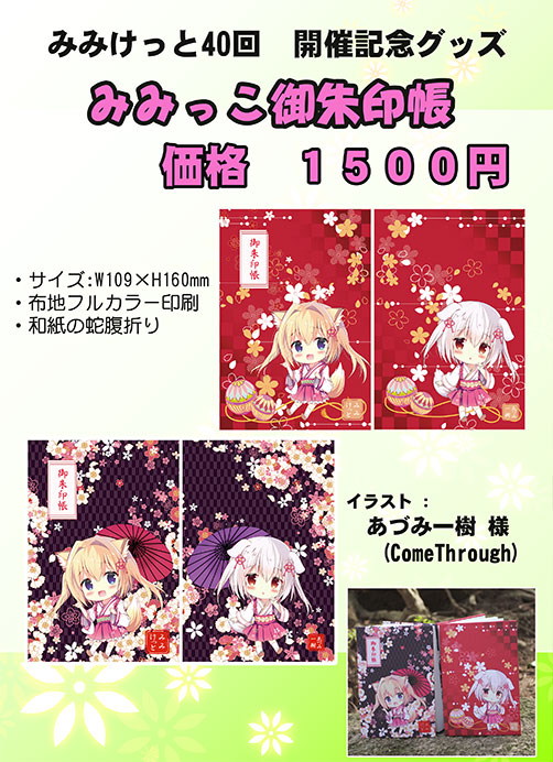 [2018/10/05]次回みみけっと41、2019/03/23(土)開催予定です。サイト更新はしばらくお待ちください。 [2018/10/02]次回みみけっと41、2019/03/03(日)開催予定です。サイト更新はしばらくお待ちください。 [2018/09/25] みみけっと40おつかれさまでした。次回みみけっと41、2019/03/30(土)開催予定です。サイト更新はしばらくお待ちください。 当日頒布した、下記御朱印帳は沢山作って、まだ残っておりますので通販予定です。 [2018/09/14] カタログの前売り案内掲載しました。 ↓当日「みみっこ御朱印帳」を頒布いたします。イラスト:あづみ一樹様 ![]() [2018/09/06] 本日、川崎駅西口郵便局より、サークル参加案内発送しました。 【QRコードスタンプラリー】のお知らせ。 ![]() ↑このカードはすべてのサークル参加者にサークル参加案内に同梱して送付しました。 スマホでこのQRコードを読むと、サークルカットが表示&ゲット出来ます。 サークルスペースでQRコードをさつえいするときは、 サークルのひとにかならずこえをかけてください。 当日、即売会終了時点でのゲット数(集めた数)の上位者に景品を進呈予定。 [2018/08/27] サークルリストに配置番号、 配置図掲載しました。 [2018/08/22] 追加募集は 2018/08/23(木)で締め切ります。 [2018/08/08] 参加サークルリスト掲載しました。 既に申込み済みサークル様におきましては、不備等を除き落選等ございません。 [2018/05/12] サイト更新しました。「みみけっと40」サークル参加要項 掲載&受付中! 過去のお知らせ |